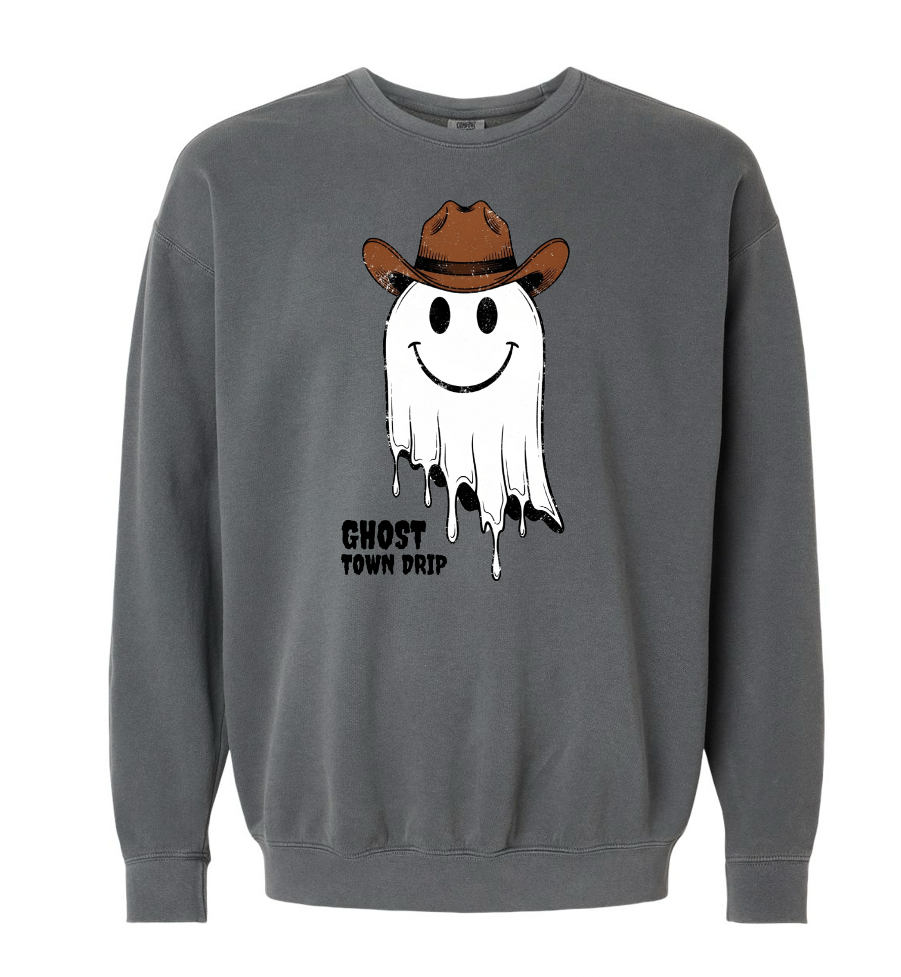 Comfort Colors crew neck in “pepper”. Large, white cowboy ghost graphic.